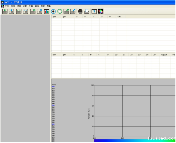 NS808的交通路标测试模块主要是通过上位机软件SQCT配合NS808仪器实现的。使用前需先安装好SQCT上位机软件,再连接NS808仪器,然后打开上位机软件,默认为普通测试界面,如图1所示,在该界面下可以完成CIE L*a*b、XYZ、ΔE*ab、ΔE*cmc、ΔE*00等色度数据的测试,详细菜单和工具栏的介绍请参照该软件自带“色彩管理控制软件使用说明书”,这里重点介绍交通路标测试模块。