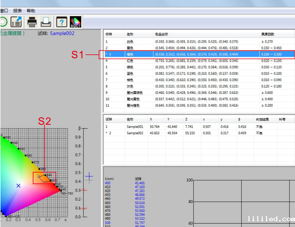 双击标样区域的蓝色,如图12中是S3所示部分,使蓝色为当前标样,蓝色多边形-容差标样(《GB/T 18833-2012道路交通反光膜样》规定的蓝色区域)则显示在S4部分。