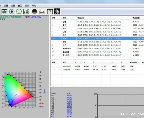 譬如如何判定蓝色试样是否在《GB/T 18833-2012道路交通反光膜样》所规定的蓝色区域内(无金属镀层,昼间反光膜颜色),按照下面的步骤,将依次完成测量和判定。