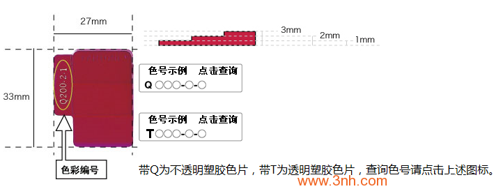 每块选色片的尺寸为27mm X 33mm(1.1"x1.3"),三种厚度为1、2及3mm(0.04、0.08和0.12英寸)。